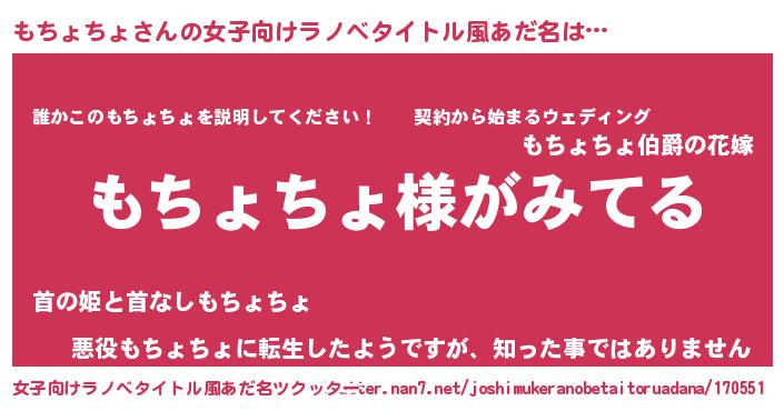| 男性向けラノベタイトル風あだ名 | 『もちょちょの嫁は女の子じゃないと思った?』 |