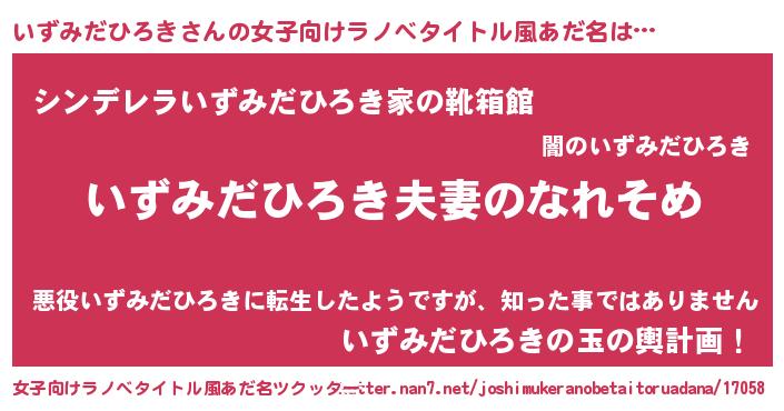 | 男性向けラノベタイトル風あだ名 | 『おまえをオタクにしてやるから、俺をいずみだひろきにしてくれ! 』 |