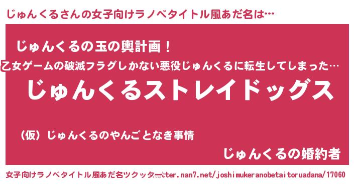 | 男性向けラノベタイトル風あだ名 | 『Re:じゅんくるから始める異世界生活』 |