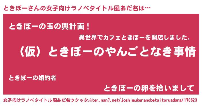 ときぼーさんの女子向けラノベタイトル風あだ名は… 『(仮)ときぼーのやんごとなき事情』『ときぼーの玉の輿計画!』『ときぼーの卵を拾いまして』 ツクッター #女子向けラノベタイトル風あだ名ツクッター http://tkutter.nan7.net/joshimukeranobetaitoruadana/170623/