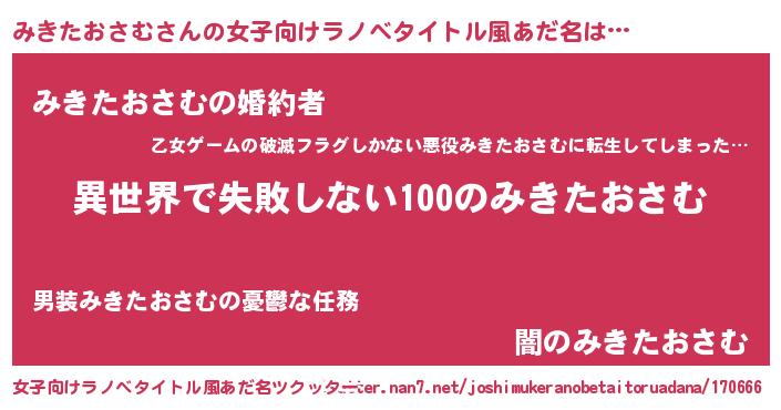 | 男性向けラノベタイトル風あだ名 | 『みきたおさむという概念が存在しない退屈な世界 』 |