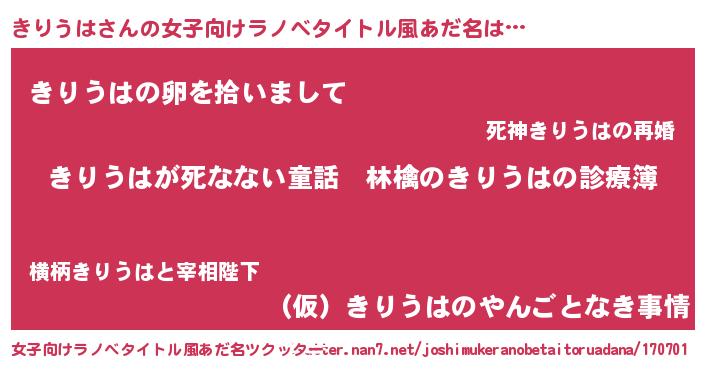 | 男性向けラノベタイトル風あだ名 | 『魔弾の王ときりうは』『きりうはの憂鬱』 |
