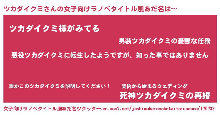 | 男性向けラノベタイトル風あだ名 | 『この素晴らしい世界にツカダイクミを!』 |