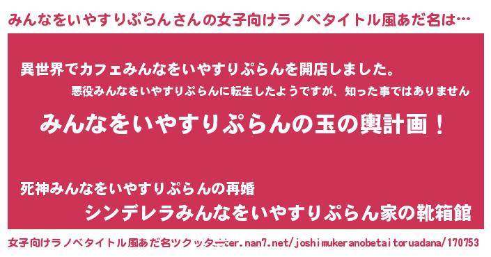 | 男性向けラノベタイトル風あだ名 | 『みんなをいやすりぷらん~年齢イコール彼女いない歴の魔法使い~』 |