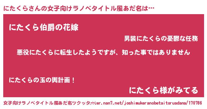 | 男性向けラノベタイトル風あだ名 | 『この素晴らしい世界ににたくらを!』 |