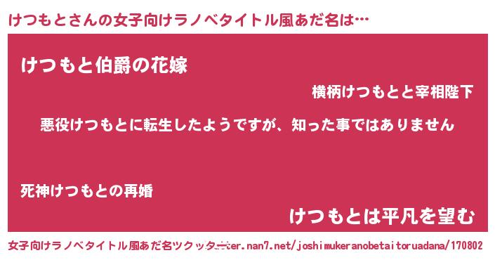 | 男性向けラノベタイトル風あだ名 | 『この素晴らしい世界にけつもとを!』 |