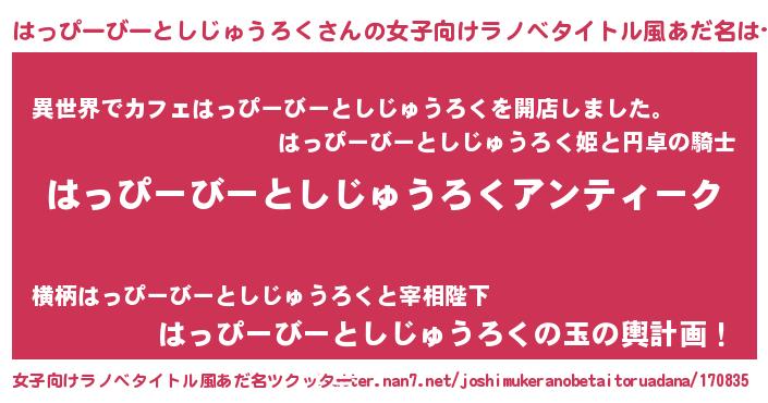はっぴーびーとしじゅうろくさんの女子向けラノベタイトル風あだ名は… 『はっぴーびーとしじゅうろくアンティーク』『異世界でカフェはっぴーびーとしじゅうろくを開店しました。』『はっぴーびーとしじゅうろくの玉の輿計画!』 ツクッター #女子向けラノベタイトル風あだ名ツクッター http://tkutter.nan7.net/joshimukeranobetaitoruadana/170835/