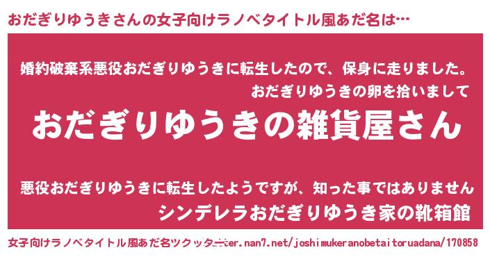 | 男性向けラノベタイトル風あだ名 | 『やはりおだぎりゆうきの青春ラブコメはまちがっている 』 |