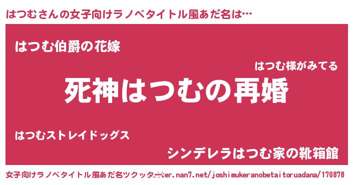 はつむさんの女子向けラノベタイトル風あだ名は… 『死神はつむの再婚』『はつむ伯爵の花嫁』『シンデレラはつむ家の靴箱館』 ツクッター #女子向けラノベタイトル風あだ名ツクッター http://tkutter.nan7.net/joshimukeranobetaitoruadana/170878/