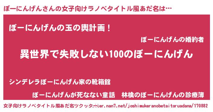 | 男性向けラノベタイトル風あだ名 | 『ぼーにんげんという概念が存在しない退屈な世界 』 |