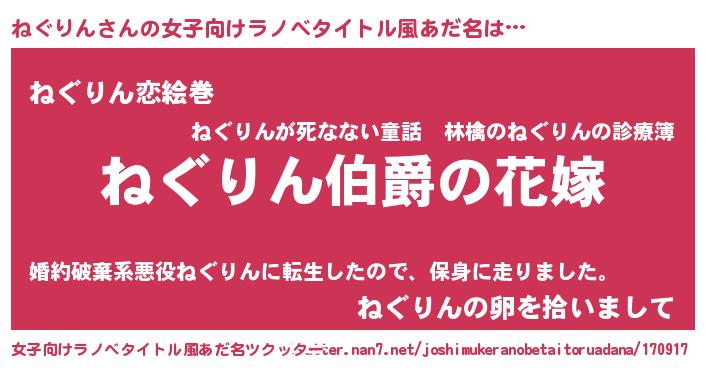 | 男性向けラノベタイトル風あだ名 | 『うちの娘の為ならば、俺はもしかしたらねぐりんも倒せるかもしれない。』 |