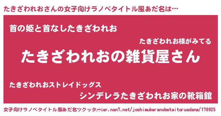 | 男性向けラノベタイトル風あだ名 | 『やはりたきざわれおの青春ラブコメはまちがっている 』 |