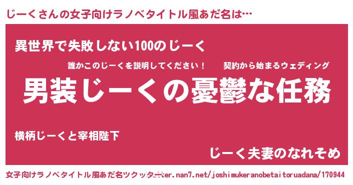 | 男性向けラノベタイトル風あだ名 | 『うちのじーくが世界を掌握している!』 |