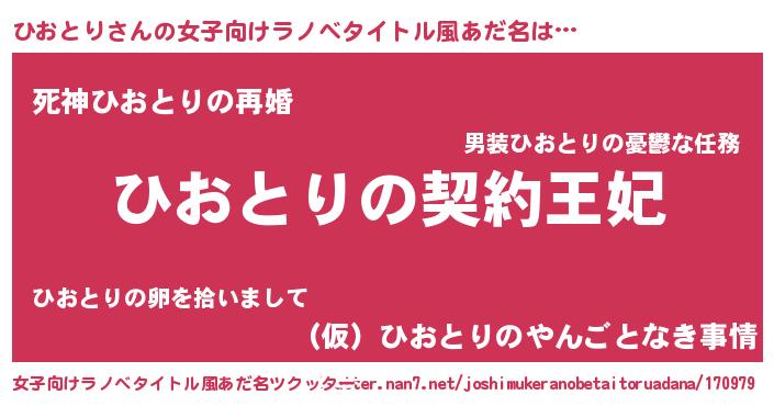 | 男性向けラノベタイトル風あだ名 | 『ひおとりという概念が存在しない退屈な世界 』 |