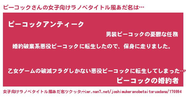 | 男性向けラノベタイトル風あだ名 | 『ピーコックスレイヤー』 |