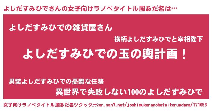 | 男性向けラノベタイトル風あだ名 | 『よしだすみひで~年齢イコール彼女いない歴の魔法使い~』 |