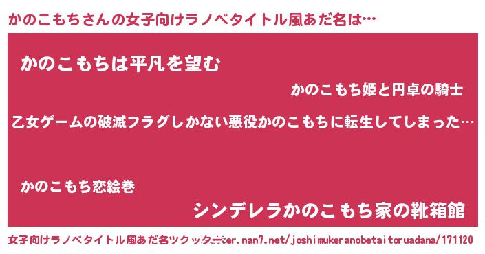 | 男性向けラノベタイトル風あだ名 | 『魔弾の王とかのこもち』 |