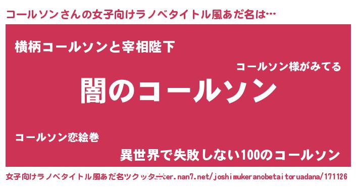 | 男性向けラノベタイトル風あだ名 | 『Re:コールソンから始める異世界生活』 |