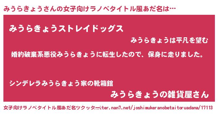 | 男性向けラノベタイトル風あだ名 | 『転生したらみうらきょうだった件』 |