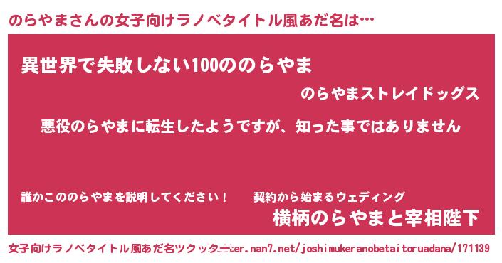 | 男性向けラノベタイトル風あだ名 | 『この素晴らしい世界にのらやまを!』 |