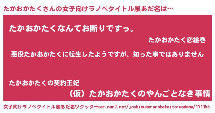 | 男性向けラノベタイトル風あだ名 | 『この素晴らしい世界にたかおかたくを!』 |