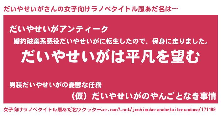 | 男性向けラノベタイトル風あだ名 | 『ダンジョンにだいやせいがを求めるのは間違っているだろうか』 |