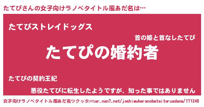 | 男性向けラノベタイトル風あだ名 | 『うちの娘の為ならば、俺はもしかしたらたてぴも倒せるかもしれない。』 |