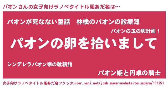| 男性向けラノベタイトル風あだ名 | 『ダンジョンにパオンを求めるのは間違っているだろうか』 |