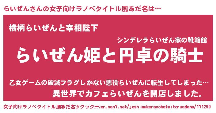 | 男性向けラノベタイトル風あだ名 | 『らいぜんの憂鬱』 |