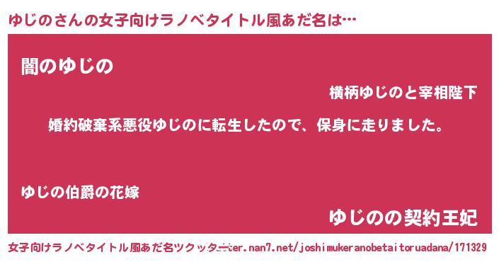 ゆじのさんの女子向けラノベタイトル風あだ名は… 『婚約破棄系悪役ゆじのに転生したので、保身に走りました。』『闇のゆじの』『ゆじのの契約王妃』 ツクッター #女子向けラノベタイトル風あだ名ツクッター http://tkutter.nan7.net/joshimukeranobetaitoruadana/171329/