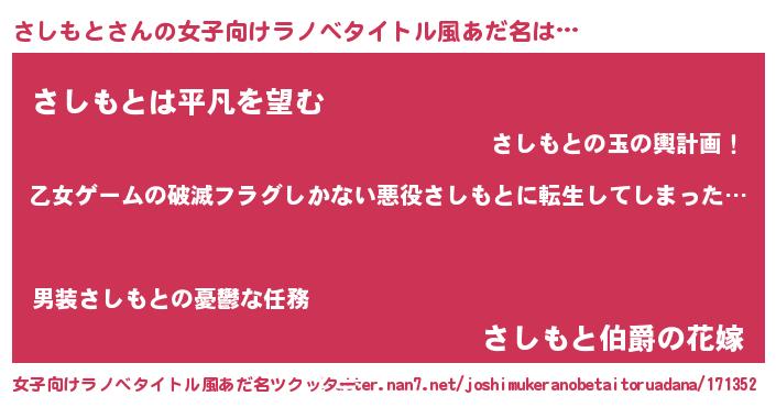| 男性向けラノベタイトル風あだ名 | 『この素晴らしい世界にさしもとを!』 |