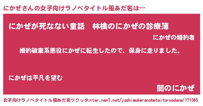 | 男性向けラノベタイトル風あだ名 | 『ニカゼスレイヤー』『魔弾の王とにかぜ』 |