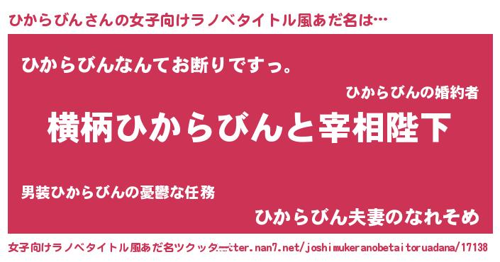 | 男性向けラノベタイトル風あだ名 | 『ひからびんに滅ぼされるだけの簡単なお仕事です』 |