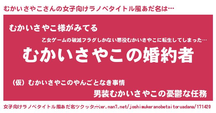 | 男性向けラノベタイトル風あだ名 | 『うちの娘の為ならば、俺はもしかしたらむかいさやこも倒せるかもしれない。』 |