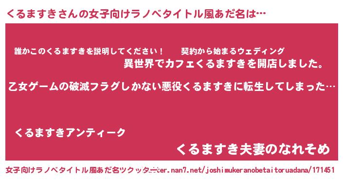 くるますきさんの女子向けラノベタイトル風あだ名は… 『乙女ゲームの破滅フラグしかない悪役くるますきに転生してしまった…』『誰かこのくるますきを説明してください! ~契約から始まるウェディング~』『くるますき夫妻のなれそめ』 ツクッター #女子向けラノベタイトル風あだ名ツクッター http://tkutter.nan7.net/joshimukeranobetaitoruadana/171451/