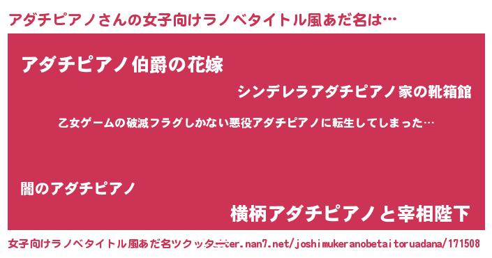 | 男性向けラノベタイトル風あだ名 | 『魔弾の王とアダチピアノ』 |
