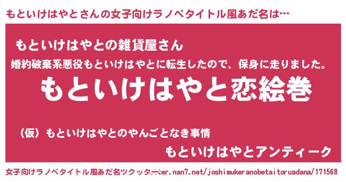 | 男性向けラノベタイトル風あだ名 | 『おまえをオタクにしてやるから、俺をもといけはやとにしてくれ! 』 |