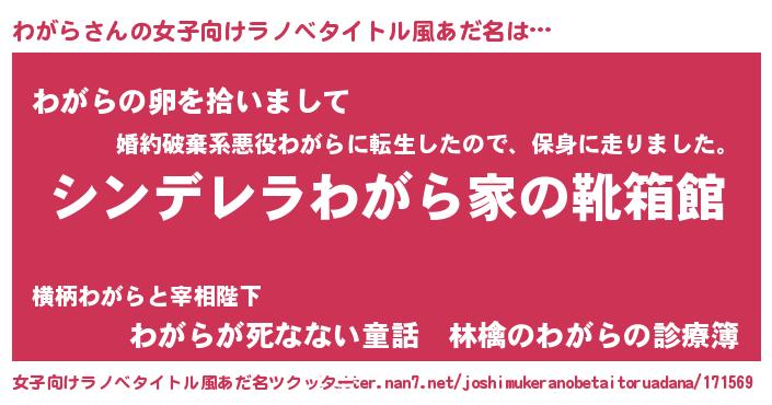 | 男性向けラノベタイトル風あだ名 | 『緋弾のワガラ』『魔弾の王とわがら』 |