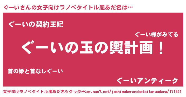 ぐーいさんの女子向けラノベタイトル風あだ名は… 『ぐーいの玉の輿計画!』『ぐーいの契約王妃』『ぐーいアンティーク』 ツクッター #女子向けラノベタイトル風あだ名ツクッター http://tkutter.nan7.net/joshimukeranobetaitoruadana/171641/