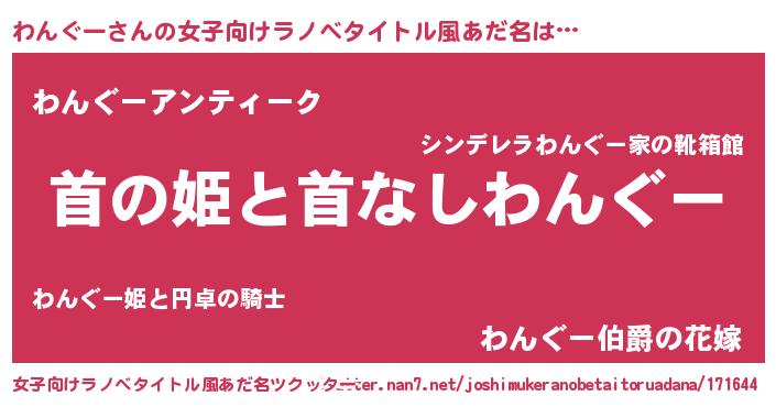 わんぐーさんの女子向けラノベタイトル風あだ名は… 『首の姫と首なしわんぐー』『わんぐーアンティーク』『わんぐー伯爵の花嫁』 ツクッター #女子向けラノベタイトル風あだ名ツクッター http://tkutter.nan7.net/joshimukeranobetaitoruadana/171644/