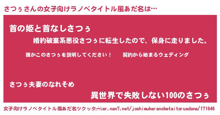 | 男性向けラノベタイトル風あだ名 | 『サツゥアートオンライン』 |