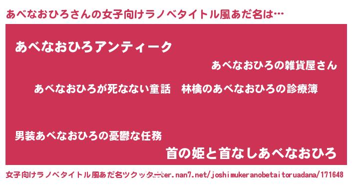 | 男性向けラノベタイトル風あだ名 | 『魔弾の王とあべなおひろ』 |