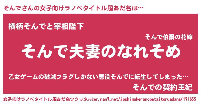 | 男性向けラノベタイトル風あだ名 | 『おまえをオタクにしてやるから、俺をそんでにしてくれ! 』 |