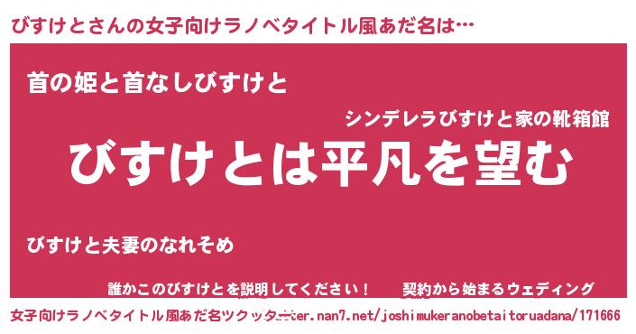 | 男性向けラノベタイトル風あだ名 | 『ダンジョンにびすけとを求めるのは間違っているだろうか』 |