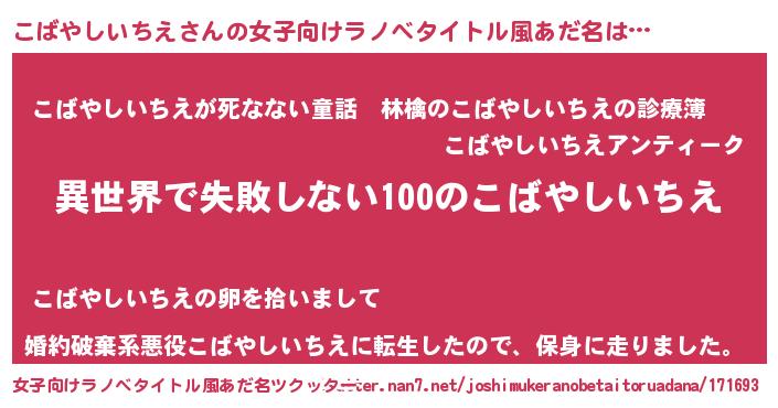 | 胡散臭い通販商品みたいなあだ名 | 『絶対に幸福をもたらす水素水…その名も「こばやしいちえ」』 |