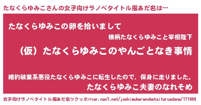 | 男性向けラノベタイトル風あだ名 | 『たなくらゆみこの憂鬱』 |