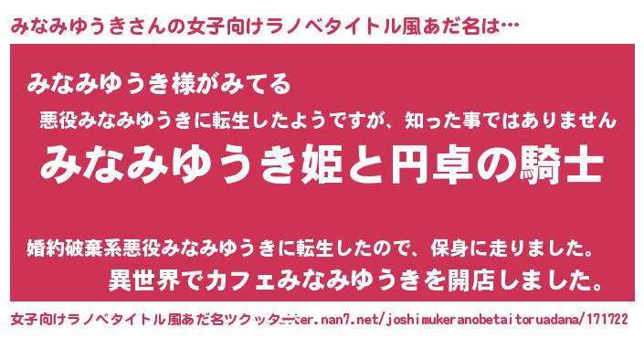 | 男性向けラノベタイトル風あだ名 | 『ミナミユウキアートオンライン』 |