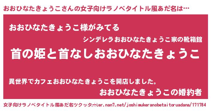 おおひなたきょうこさんの女子向けラノベタイトル風あだ名は… 『首の姫と首なしおおひなたきょうこ』『おおひなたきょうこ様がみてる』『おおひなたきょうこの婚約者』 ツクッター #女子向けラノベタイトル風あだ名ツクッター http://tkutter.nan7.net/joshimukeranobetaitoruadana/171784/