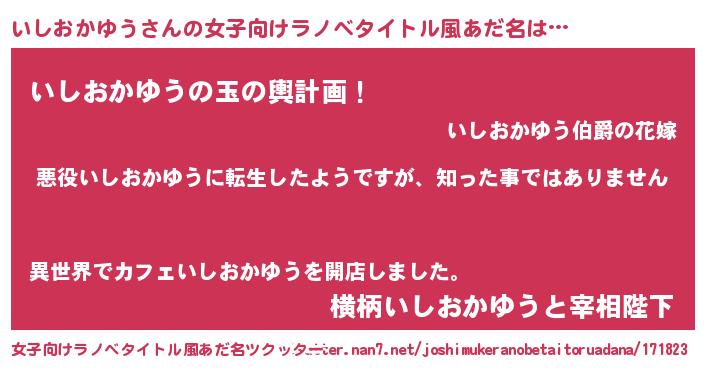 | 男性向けラノベタイトル風あだ名 | 『この素晴らしい世界にいしおかゆうを!』 |