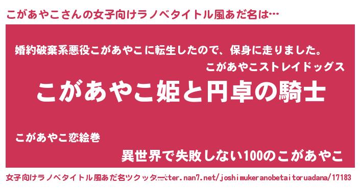 | 男性向けラノベタイトル風あだ名 | 『コガアヤコアートオンライン』 |